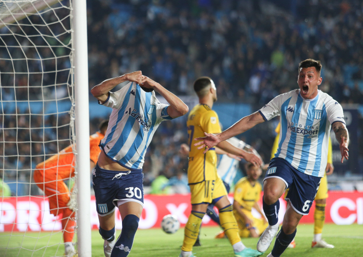 xLeonardo Sigali festeja el segundo gol de Racing frente a Boca. Foto NA.