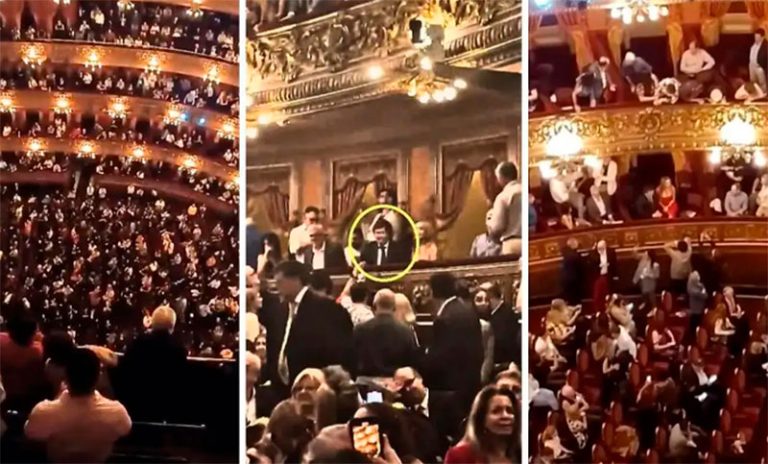 Todo ocurrió durante el intervalo entre el primer y el segundo acto, cuando el público reconoció al candidato de La Libertad Avanza. Allí surgieron surgieron los cánticos: «Milei, basura, vos sos la dictadura». El griterío, fue algo inédito para el teatro Colón. Incluso la orquesta tocó la marcha peronista.