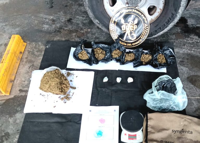 Por ese motivo, los efectivos se trasladaron hacia allí y al llegar observan a un sujeto que estaba escondido detrás de uno de los camiones estacionados en el sector de atrás del playón de expendio, quien al notar la presencia de los agentes, arroja una bolsa e intenta darse a la fuga corriendo, siendo demorado al instante, tratándose de un muchacho de 26 años, detectando que en la bolsa se hallaban 6 envoltorios de polietileno color negro, y otro transparente de mayor dimensión, con imagen de una rosa negra pegada, todos ellos conteniendo marihuana, arrojando un pesaje de 461 gramos.