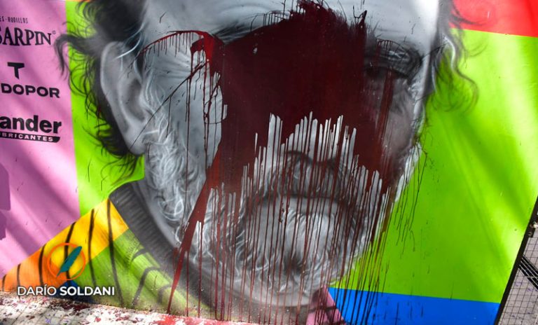 La obra, ubicada en Montevideo 1865, fue dañada con pintura negra y cubrió el rostro del escritor rosarino homenajeado.