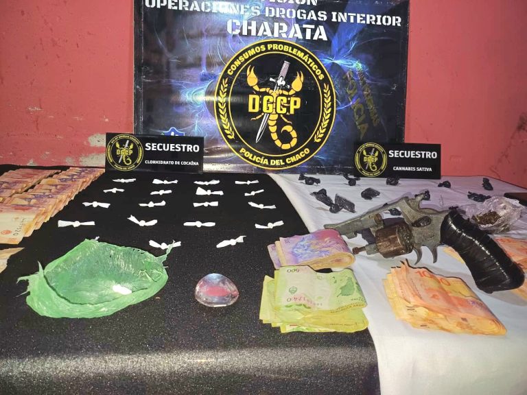 La inspecci贸n finaliz贸 cerca de las 22 horas y se pudo detectar un trozo compacto peque帽o de Coca铆na y 19 dosis de la sustancia con un peso de 4 gramos, como as铆 tambi茅n, 14 bochitas con Marihuana que dieron el pesaje de 14 gramos, una cuchara con restos de droga, retazos de bolsas, dos tel茅fonos celulares, la suma en efectivo de $67.500, y un rev贸lver calibre 22 con tambor de 8 alve贸los.