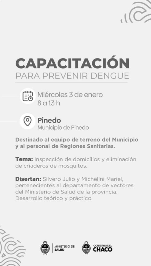 El gobierno del Chaco fortalece el plan de lucha contra el dengue, con capacitaciones y trabajos en territorio en toda la provincia. En ese contexto inician, este miércoles, capacitaciones para equipos municipales, tanto para el manejo de insecticidas como para el control, descacharrado y fumigación. Además, continúa la agenda de fumigaciones espaciales en los diferentes municipios.