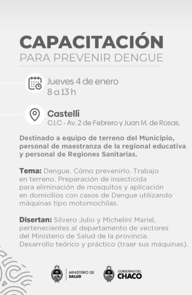 El 3 y 4 de enero se realizarán capacitaciones presenciales en Castelli y Pinedo destinadas al personal municipal, en tanto el jueves se sumará una formación online para trabajadores que manipulen cipermetrina concentrada como insecticida. La agenda de fumigación continuó en Machagai y Quitilipi.