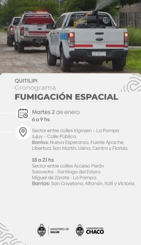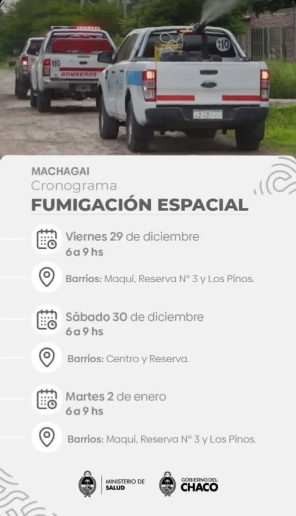 La cartera continúa realizando la agenda de fumigaciones espaciales en los diferentes municipios. En la mañana de este martes se fumigó en los barrios Maqui, Reserva N°3 y Los Pinos de Machagai y los barrios Nueva Esperanza, Fuerte Apache, Libertad, San Martín, Usina, Centro y Florida de Quitilipi, mientras que a tarde continuará en los barrios San Cayetano, Alfonsín, Itatí y Victoria.