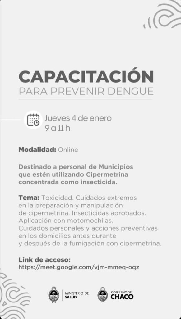 El 4 de enero, de 9 a 11, se realizará una capacitación online destinada al personal municipal que trabaja con cipermetrina concentrada como insecticida. El curso tiene como finalidad abordar temas de toxicidad, cuidados extremos en la preparación y manipulación de cipermetrina, insecticidas aprobados, aplicación con motomochilas, cuidados personales y acciones preventivas en los domicilios antes, durante y después del proceso de fumigación e inspección de domicilios y eliminación de criaderos de mosquitos.