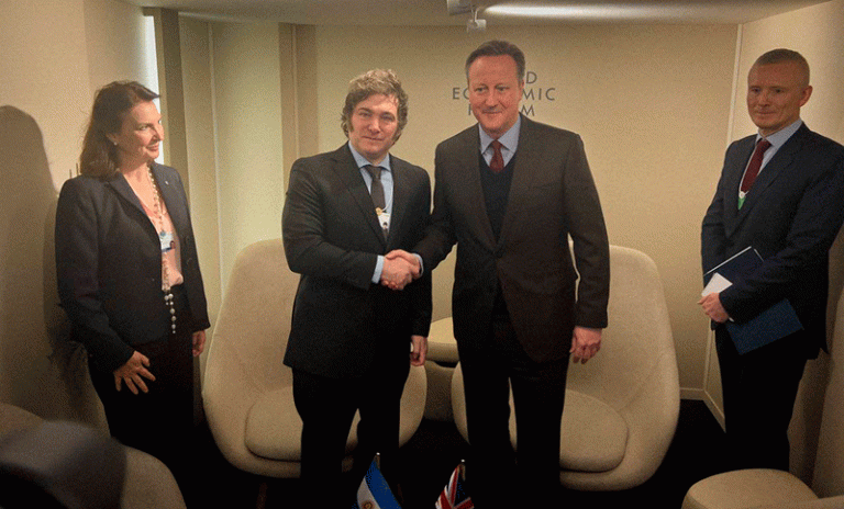 En el marco del Foro Económico Mundial que se desarrolla en Davos, el presidente Javier Milei mantuvo este miércoles un encuentro con el secretario de Estado para las Relaciones Internacionales del Reino Unido, David Cameron. Sobre las 13.30 hora argentina se reunirá con la directora gerente del Fondo Monetario Internacional, Kristalina Georgieva.