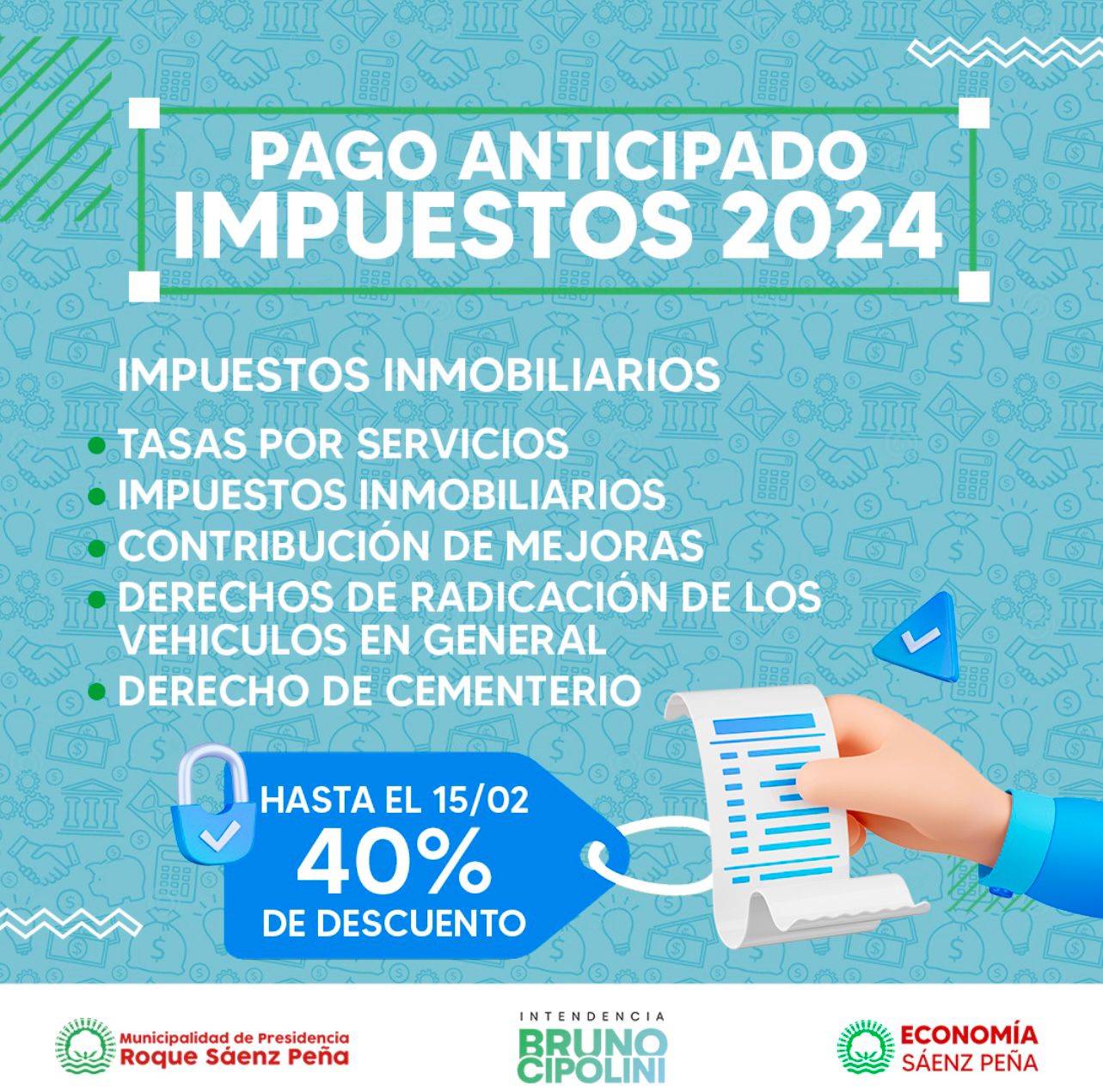Hasta el 15 de febrero inclusive, se encuentra vigente el beneficio que ofrece el Municipio a través de la Secretaría de Economía con hasta un 40% de descuento en el pago anticipado de los impuestos 2024, los mismos pueden ser abonados de forma presencial o por canales electrónicos a través de la página del municipio.