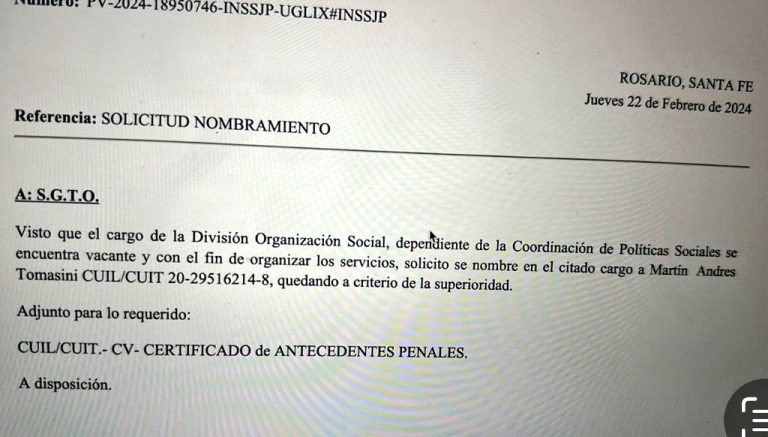 Si bien la diputada negó rotundamente el señalamiento de Tomassini como titular de la División Organización Social del Pami, la solicitud de nombramiento por parte del titular de la regional local, Guido Orlandi, a las autoridades tiene fecha del jueves 22 de febrero.