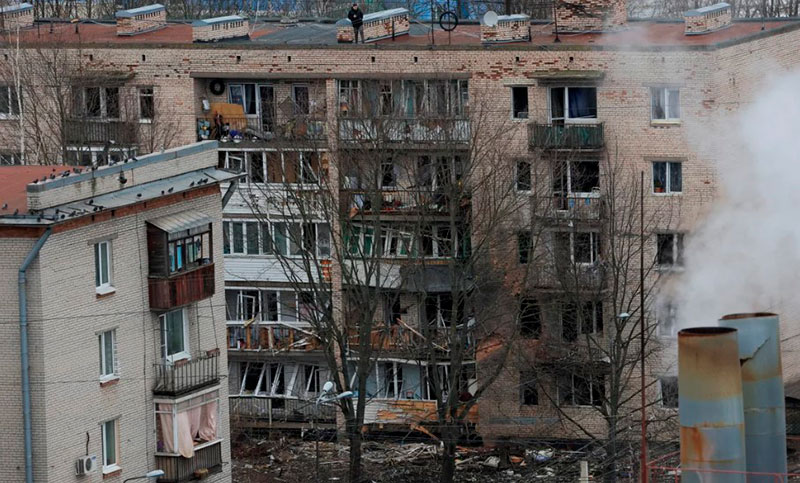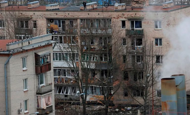 Un vídeo de Reuters en el lugar de los hechos mostraba la fachada dañada de un edificio con ventanas reventadas, balcones dañados y cristales y escombros destrozados en el suelo.