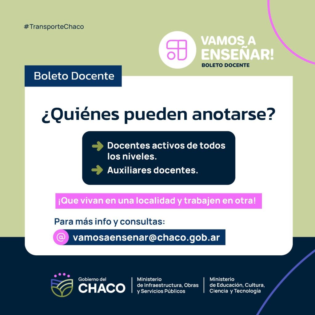 El gobierno de la Provincia del Chaco, a través del Ministerio de de Infraestructura, Obras y Servicios Públicos y la Subsecretaría de Transporte y Logística del Ministerio y en conjunto con el Ministerio de Educación, Cultura, Ciencia y Tecnología, anunciaron el lanzamiento del Programa “Vamos a Enseñar” del Boleto Docente.