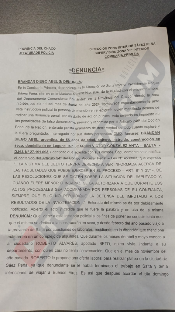 En la misma detalló que se dedica a la construcción en seco, y en febrero del año pasado viajó a la provincia de Salta por cuestiones laborales, residiendo en Joaquín V. González en un complejo de alquileres. Es allí que entre el mes de abril y mayo conoció al ciudadano Roberto Álvarez apodado «Beto», quien vivía lindante a su departamento, con quien casi no tenía conversación.