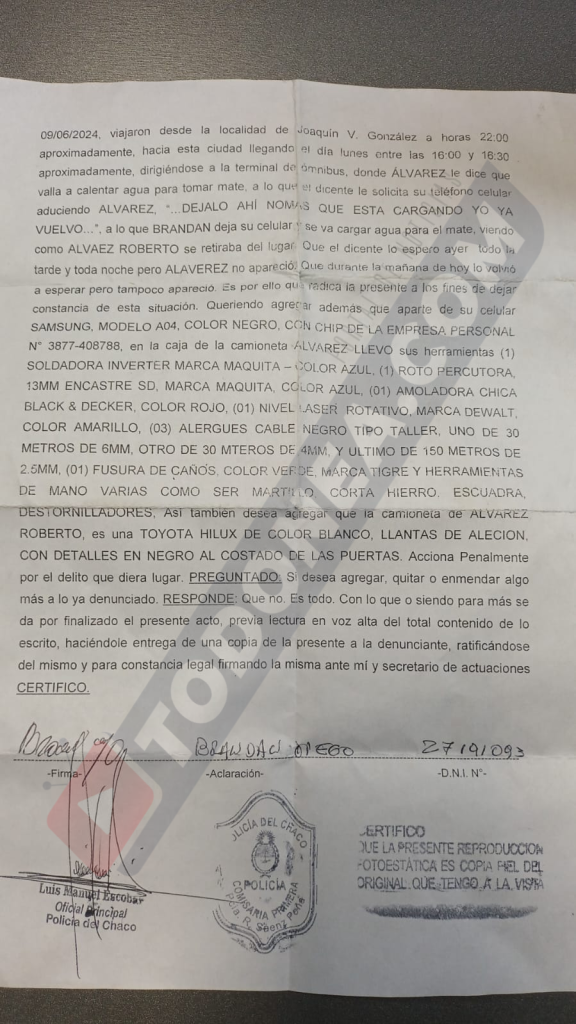 Domingo por la noche viajaron desde la localidad de Joaquín V. González llegando el lunes alrededor de las 16:00 horas a la Terminal de Ómnibus. En una oportunidad, Álvarez le indica que vaya a calentar agua para el mate y deja su celular cargando, al volver no estaba, lo esperó todo el día y no apareció. Es entonces, que Brandan procede a radicar la denuncia detallando que este hombre se ha llevado su celular marca samsung, y herramientas de trabajo como ser: 1) SOLDADORA INVERTER MARCA MAQUITA-COLOR AZUL, (1) ROTO PERCUTORA 13MM ENCASTRE SD MARCA MAQUITA COLOR AZUL, (01) AMOLADORA CHICA BLACK & DECKER, COLOR ROJO, (01) NIVEL LASER ROTATIVO, MARCA DEWALT COLOR AMARILLO, (03) ALARGUES CABLE NEGRO TIPO TALLER DE 30 METROS DE 6MM, OTRO DE 30 MTEROS DE 4MM, Y ULTIMO DE 150 METROS DE 25MM, (01) FUSURA DE CAÑOS COLOR VERDE MARCA TIGRE Y HERRAMENTAS DE MANO VARIAS.