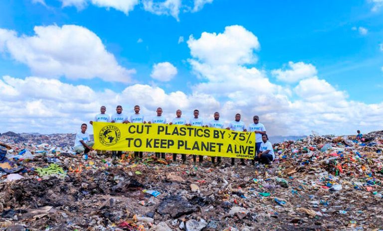 Voluntarios de Greenpeace África con una pancarta que dice “Reducir los plásticos en un 75% para mantener vivo el planeta”, en el corazón del vertedero de Dandora.