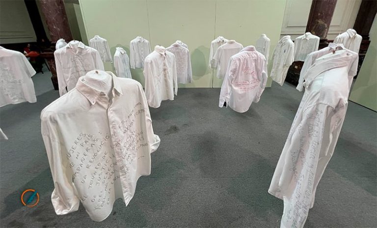 Y señala sobre las frases bordadas por las “descamisadas” sobre las camisas blancas que cuelgan del techo del primer piso del ECU.