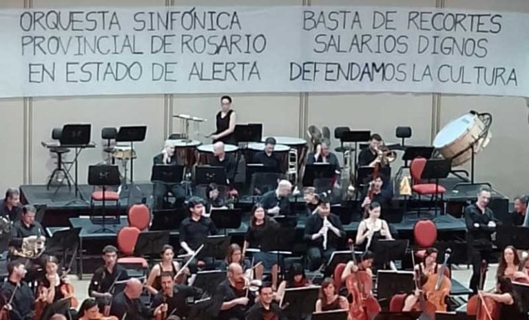 En este sentido, durante su última presentación en el teatro El Círculo, la Orquesta desplegó una bandera para indicar el “estado de alerta” y visibilizar la situación: “Basta de recortes, salarios dignos, defendamos la cultura”.