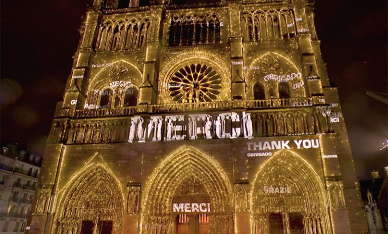 La ceremonia comenzó con una película de homenaje en la que se rindió tributo a todos aquellos que participaron en el rescate y la restauración de Notre-Dame. “Gracias” en múltiples idiomas fue la palabra que se proyectó sobre la fachada de la icónica catedral.