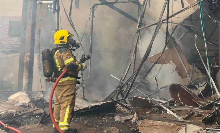 El impacto se produjo sobre una vivienda, un local comercial y un hospedaje, según informaron los bomberos, que luchaban por extinguir las llamas producidas por el siniestro.
