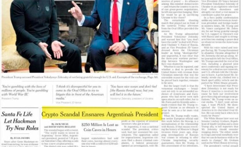 Este sábado, The New York Times decidió que la nota sea la que ocupe el tercer lugar por orden de aparición en la tapa de su edición impresa. De no haber sido por la polémica mundial entre el presidente estadounidense, Donald Trump y su par de Ucrania, Volodimir Zelensky, durante su reunión en la Casa Blanca, el artículo sobre Milei quizás hasta hubiera tenido una preponderancia mayor.