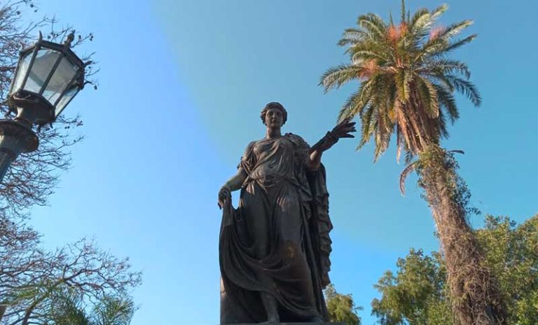 Esta escultura nos trae a los rosarinos un pedacito de Nápoles ya que una similar puede apreciarse en mármol en la romántica ciudad italiana.