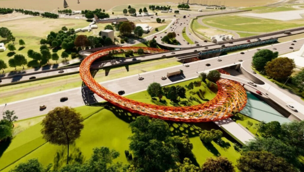 El puente peatonal y una ciclovía circular, con forma de anillo, se destacarán por su estética innovadora. Con un diámetro de 140 metros, el puente será visible desde el aire, los parques aledaños, la autopista y el ferrocarril Belgrano Norte. La estructura no sólo cruzará la barrera urbana, funcionará como mirador panorámico: desde el punto elevado se podrá observar cómo despegan y aterrizan los aviones.