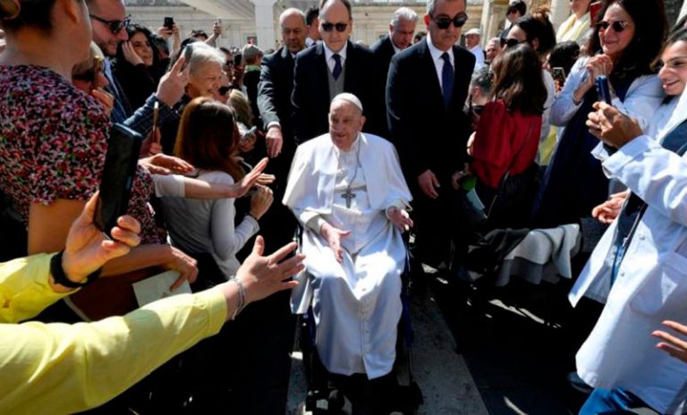 “Buen domingo a todos. Muchas gracias”, alcanzó a decir el Papa en un estado de notable debilidad, según mostraron las imágenes difundidas por el Vaticano. Francisco no pudo dar un mensaje completo, pero pasó brevemente entre los fieles en un clima de aplausos, emoción y gritos de «¡Viva el Papa!».
