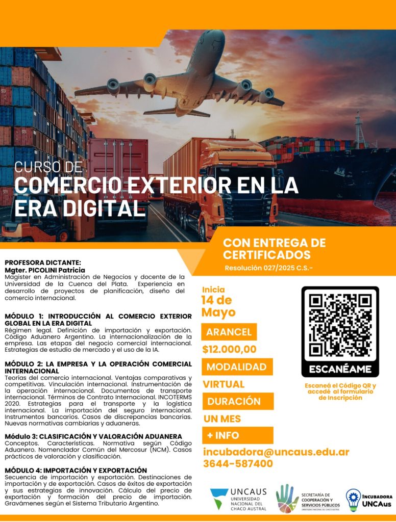 Curso dirigido a emprendedores, estudiantes, profesionales, empleados de PyMEs y p煤blico en general interesado. El curso busca ense帽ar a los participantes c贸mo el comercio exterior en un mundo globalizado puede impulsar el crecimiento econ贸mico de las empresas al expandir sus operaciones, mitigar riesgos y promover pr谩cticas comerciales responsables. 馃洅馃摬