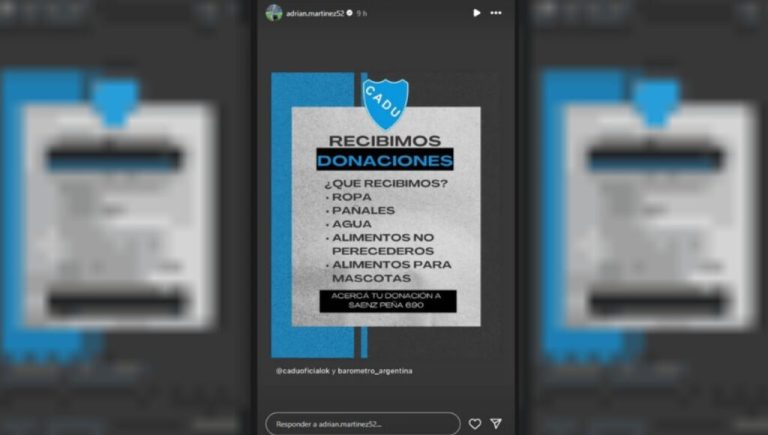 El futbolista compartió una imagen del club CADU con el llamado a donar ropa, pañales, agua, alimentos no perecederos y alimentos para mascotas, en el marco de una campaña para ayudar a los damnificados que tiene como centro de recepción la sede de Sáenz Peña 690, en Zárate.