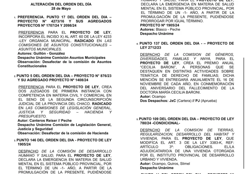 Entre los temas están la incorporación del inciso X al artículo 60 de la Ley 4233, orgánica municipal; la modificación del artículo 3.° de la Ley 3383-K, sobre obligaciones del adjudicatario de una vivienda otorgada por el Instituto Provincial de Desarrollo Urbano y Vivienda; incluir un cuarto párrafo en el artículo 126, y el inciso D al artículo 130 de la Ley 800-H.