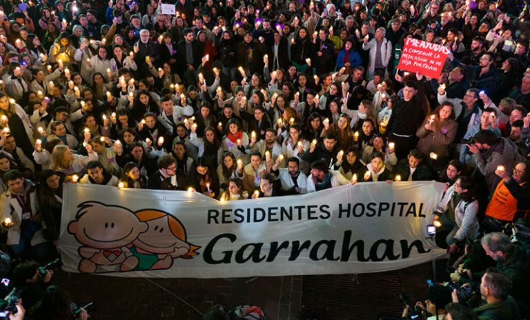 Este lunes por la tarde, los residentes convocaron a una manifestación en el Obelisco bajo el lema “velas violetas por el Garrahan”, en defensa de sus condiciones laborales y del sistema público de salud. “Encendemos una vela por cada niño que llega a nuestra institución, por cada mañana que nos colgamos el estetoscopio, por cada guardia sin dormir, por cada abrazo con esas madres, por cada médico que asiste” anuncian en sus redes.