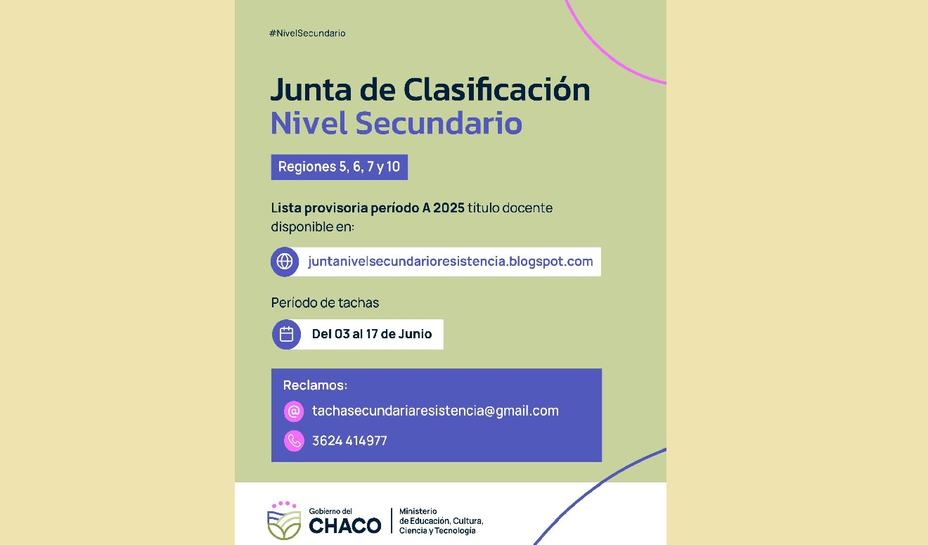 El Ministerio de Educación, a través de la Junta de Clasificación de Nivel Secundario, Regiones 5, 6, 7 y 10 (Sede Resistencia), comunica que ya está disponible la Lista Provisoria Periodo A 2025 Título Docente. La misma puede ser consultada en el sitio juntanivelsecundarioresistencia.blogspot.com