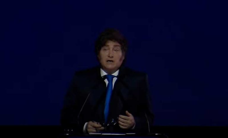 «Quiero felicitar a la Bolsa de Comercio de Rosario por un nuevo aniversario, me llena de orgullo poder estar acá y haber sido invitado», arrancó diciendo el libertario, reconociendo a la entidad.