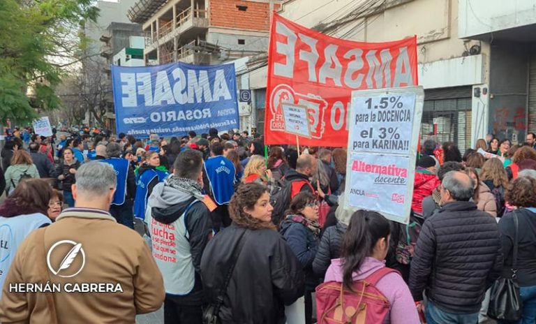 Uno de los gremios convocantes fue el sindicato de docentes oficiales, AMSAFE, uno de sus referentes, Paulo Juncos le manifestó a Conclusión que “marchamos por la reapertura de la paritaria, porque el gobierno provincial vuelva a convocar a los docentes y le haga una propuesta salarial que tenga que ver con las necesidades reales de los trabajadores y las trabajadoras y no con lo que ha ofrecido, que realmente es prácticamente una provocación, una burla. Sabemos hoy cuál es el costo de vida en la Argentina, y hoy sabemos hasta qué altura del mes puede vivir un trabajador con 800.000 pesos, que es la propuesta del gobierno provincial, para un salario docente en la provincia de Santa Fe”.