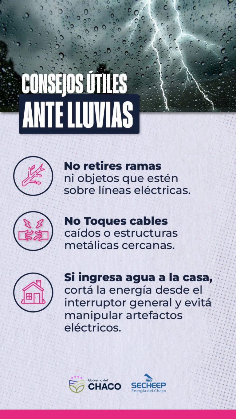 Ante una nueva jornada de lluvia que afectan a gran parte del territorio provincial, SECHEEP recuerda y reitera a la comunidad una serie de recomendaciones fundamentales para priorizar la seguridad eléctrica y prevenir accidentes.