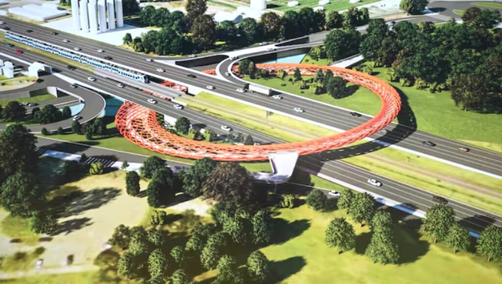 El puente peatonal y una ciclovía circular, con forma de anillo, se destacarán por su estética innovadora. Con un diámetro de 140 metros, el puente será visible desde el aire, los parques aledaños, la autopista y el ferrocarril Belgrano Norte. La estructura no sólo cruzará la barrera urbana, funcionará como mirador panorámico: desde el punto elevado se podrá observar cómo despegan y aterrizan los aviones.