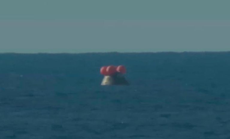 Luego, a medida que la cápsula redujo su velocidad, se desplegó una secuencia de paracaídas que permitió estabilizar el descenso. Primero se activaron los paracaídas de frenado y, posteriormente, los principales, logrando disminuir la velocidad hasta un nivel seguro para el impacto controlado en el agua.